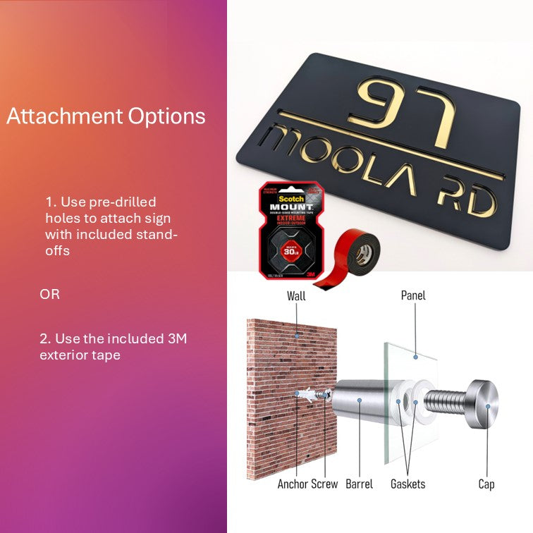 Our address signs are shipped with 3M double sided outdoor tape which will adhere to painted/finished wood, metal, painted concrete and smooth stone. Installation instructions are provided with the sign