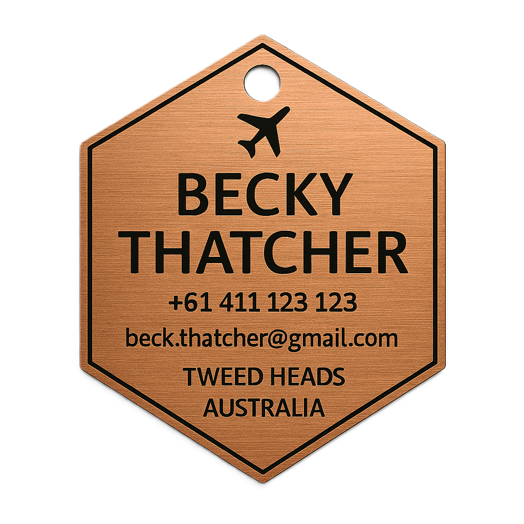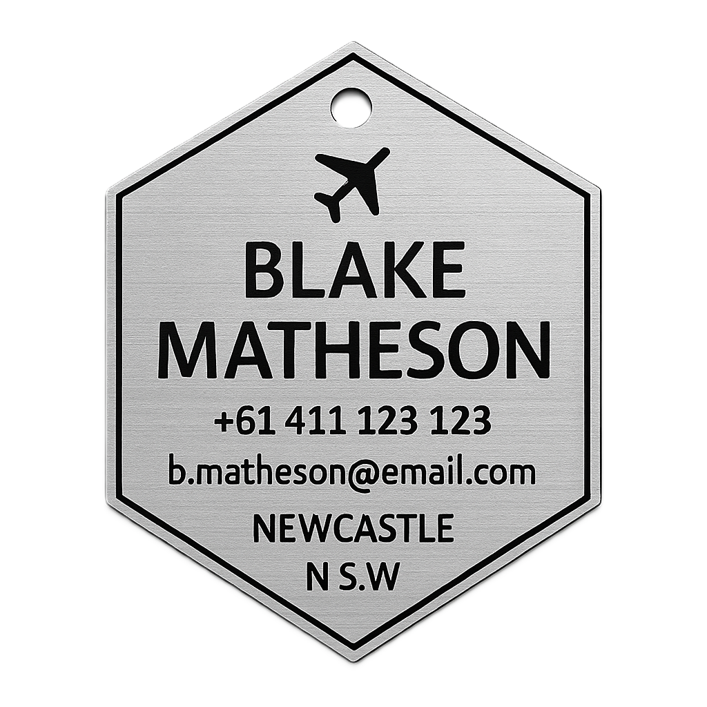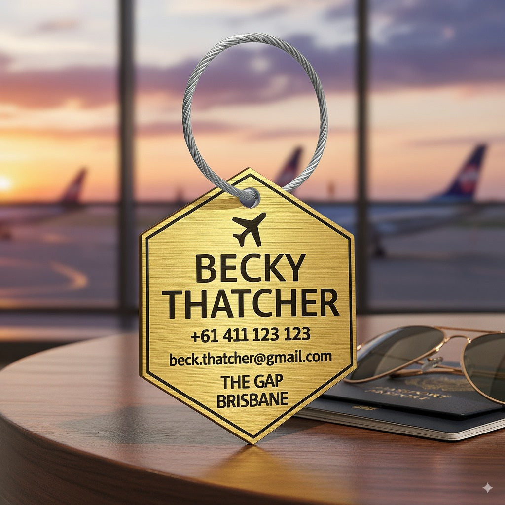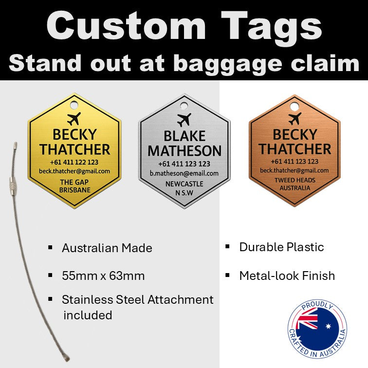 Upgrade your travel essentials with our premium brushed metal-look luggage tags - available in copper, silver, and gold finishes. Each tag is precision-cut into a sleek hexagonal shape (55mm wide × 63mm high) and engraved with your custom contact details, making lost luggage a thing of the past.