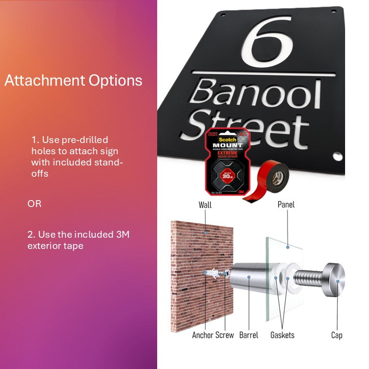 Our address signs are shipped with both Stand-Offs and 3M double sided outdoor tape - which will adhere to painted/finished wood, metal, painted concrete and smooth stone. Installation instructions are provided with the sign