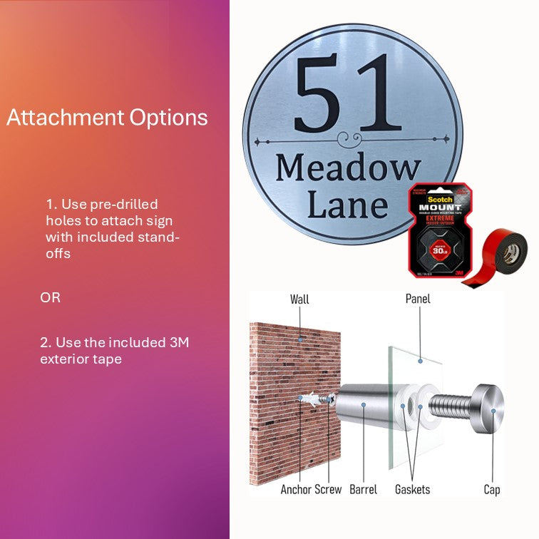 Our address signs are shipped with both Stand-Offs and 3M double sided outdoor tape - which will adhere to painted/finished wood, metal, painted concrete and smooth stone. Installation instructions are provided with the sign